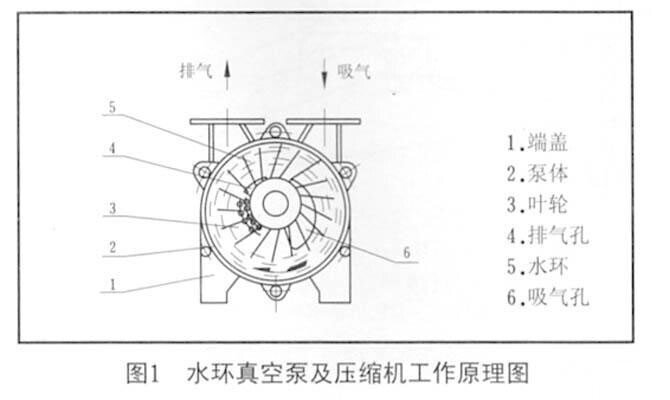 ??如圖1所示,葉輪3偏心地安裝在泵體2內(nèi),因此當(dāng)葉輪3旋轉(zhuǎn)時(shí),水受離心力的作用而在泵體內(nèi)壁形成一旋轉(zhuǎn)水環(huán)5,水環(huán)上部?jī)?nèi)表而與輪轂相切沿箭頭方向旋轉(zhuǎn),在前半轉(zhuǎn)過(guò)程中,水環(huán)內(nèi)表面逐漸與輪轂脫離,因此在葉輪葉片間與水環(huán)形成封閉空問(wèn),隨著葉輪的旋轉(zhuǎn),該空間逐漸擴(kuò)大,空間氣體壓力降低.氣體被吸入空間:在后半轉(zhuǎn)過(guò)程中, 水環(huán)內(nèi)表面漸漸與輪轂禹靠近,葉片間的空間逐漸縮小,空間氣體壓力升高,高于排氣口壓力時(shí),葉片間的氣體被排出, 如此葉輪每轉(zhuǎn)動(dòng)一周,葉片間的空間吸排一次,許多空間不停地工作,泵就連續(xù)不斷地抽吸或壓送氣體。